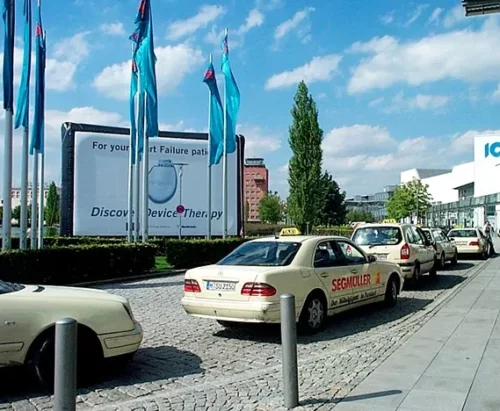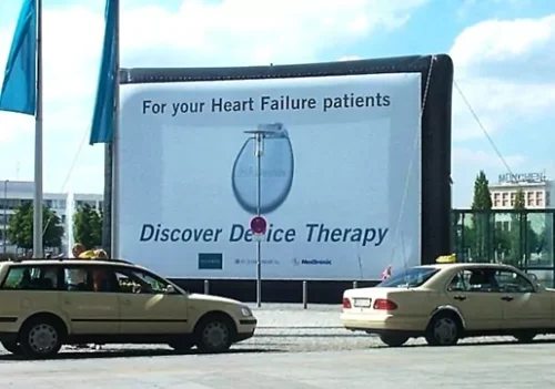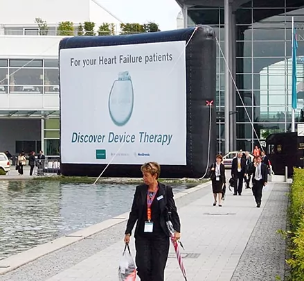 Aufblasbare Rahmensysteme bieten eine schnelle Kommunikation in großer Dimension. Das Aufblasen erledigt ein kleines Gebläse in Minutenschnelle. Hinlegen – Werbefläche aufkletten, aufrichten, verzurren, fertig. Schneller geht´s nicht.