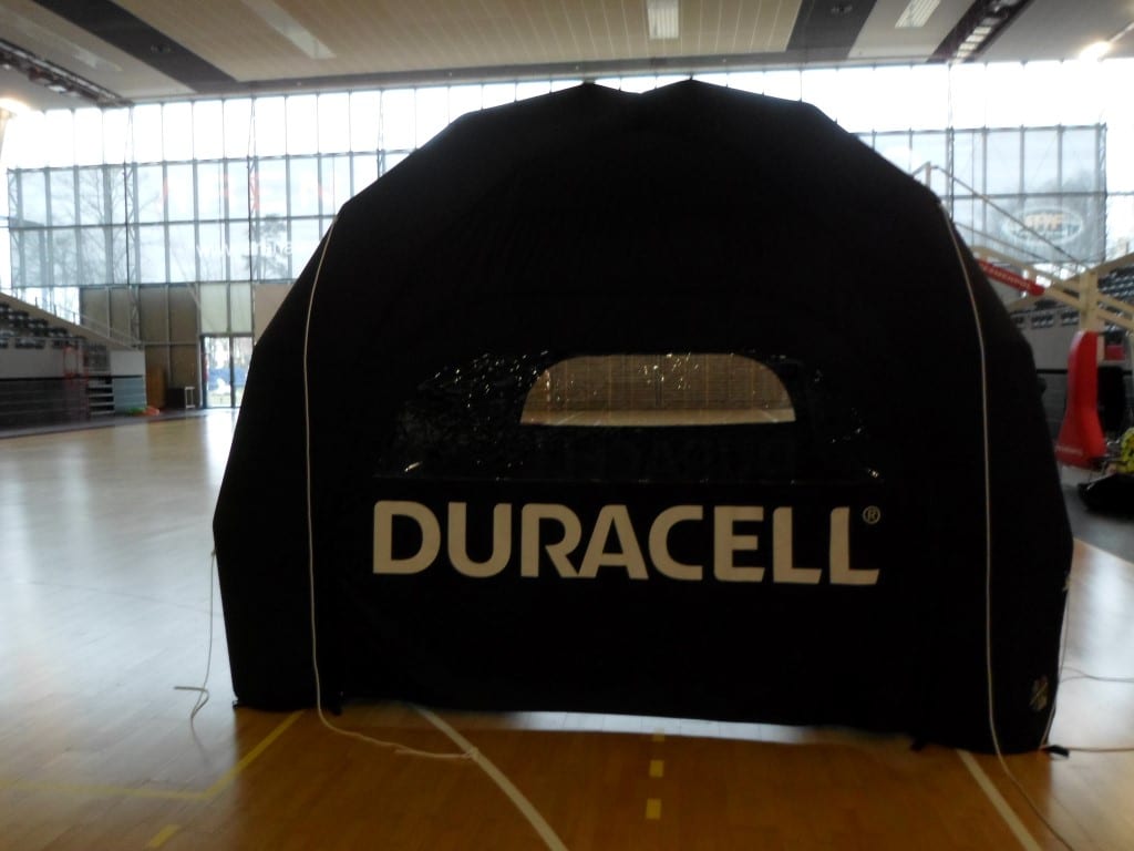 Für Duracell haben wir ein aufblasbares Zelt mit den Innenmaßen ca. 4,00 x 4,00 m hergestellt. Die Tubes haben einen Durchmesser von ca. 0,90 m.