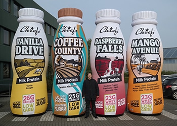 Für unseren Kunden Chiefs haben wir vier aufblasbare Flaschen in 5 m Höhe produziert. Die Flaschen haben einen Holzboden mit einem Durchmesser von 1,40 m, auf dem das Dauer-Gebläse und die LED-Beleuchtung installiert ist. So haben die Flaschen einen sicheren Stand und können auf Messen für den neuen Protein-Shake werben.