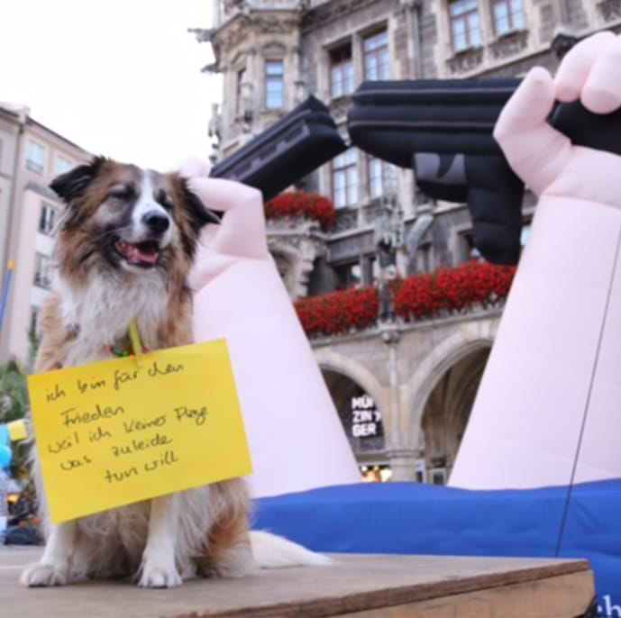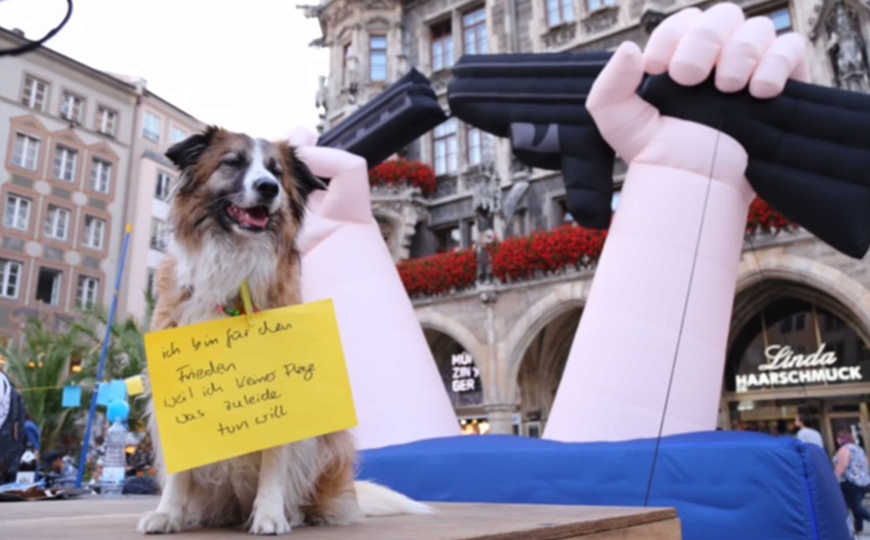 Für die Deutsche Friedensgesellschaft Bayern (DFG-VK) haben wir aufblasbare Hände mit einer zerbrochenen Waffe hergestellt. Das Objekt steht auf einem ca. 1,00 m hohen bedruckten Sockel. Die Hände mit der Waffe gehen auf eine Gesamthöhe von 4,00 m.