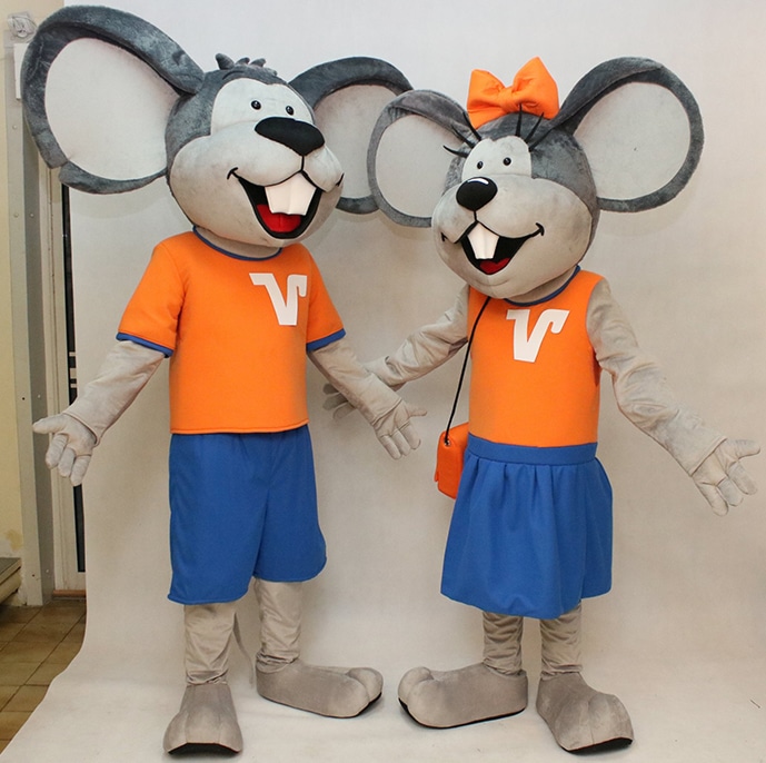 Zwei Mäuse als Walking-Act-Kostüme haben wir für die Volksbank Hessen hergestellt. Die Walking Act Mäuse werden auf diversen Vernastaltungen im Rhein-Main-Gebiet eingesetzt werden. Material: Plüsch, Polyester. Größe ca. 1,85 m.