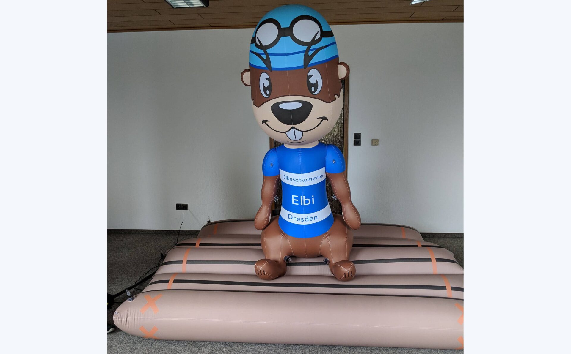 Für unseren Kunden Stadtentwässerung Dresden haben wir einen aufblasbaren Biber produziert. Das Material ist 0.30 mm PVC. Der Biber ist 2 m hoch und sitzt auf einem Floß. Er soll bei Schwimmveranstaltungen in der Elbe als Maskottchen mitschwimmen.
