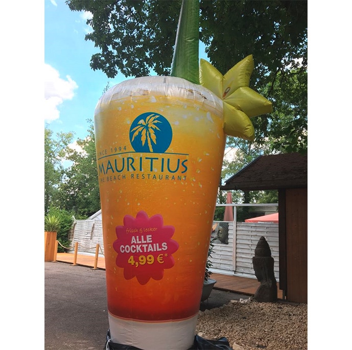 Für Mauritius haben wir ein aufblasbares Cocktailglas in 3m Höhe hergestellt. Material: PVC 300 gr/qm mit Dauergebläse und Beleuchtung auf dem Standfuß.