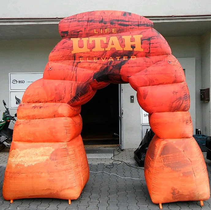 Wir haben einen Torbogen in Sonderform hergestellt: der Delicate Arch aus Utah wurde als Vorlage nachgebaut und auf Polyester b1 voll bedruckt.