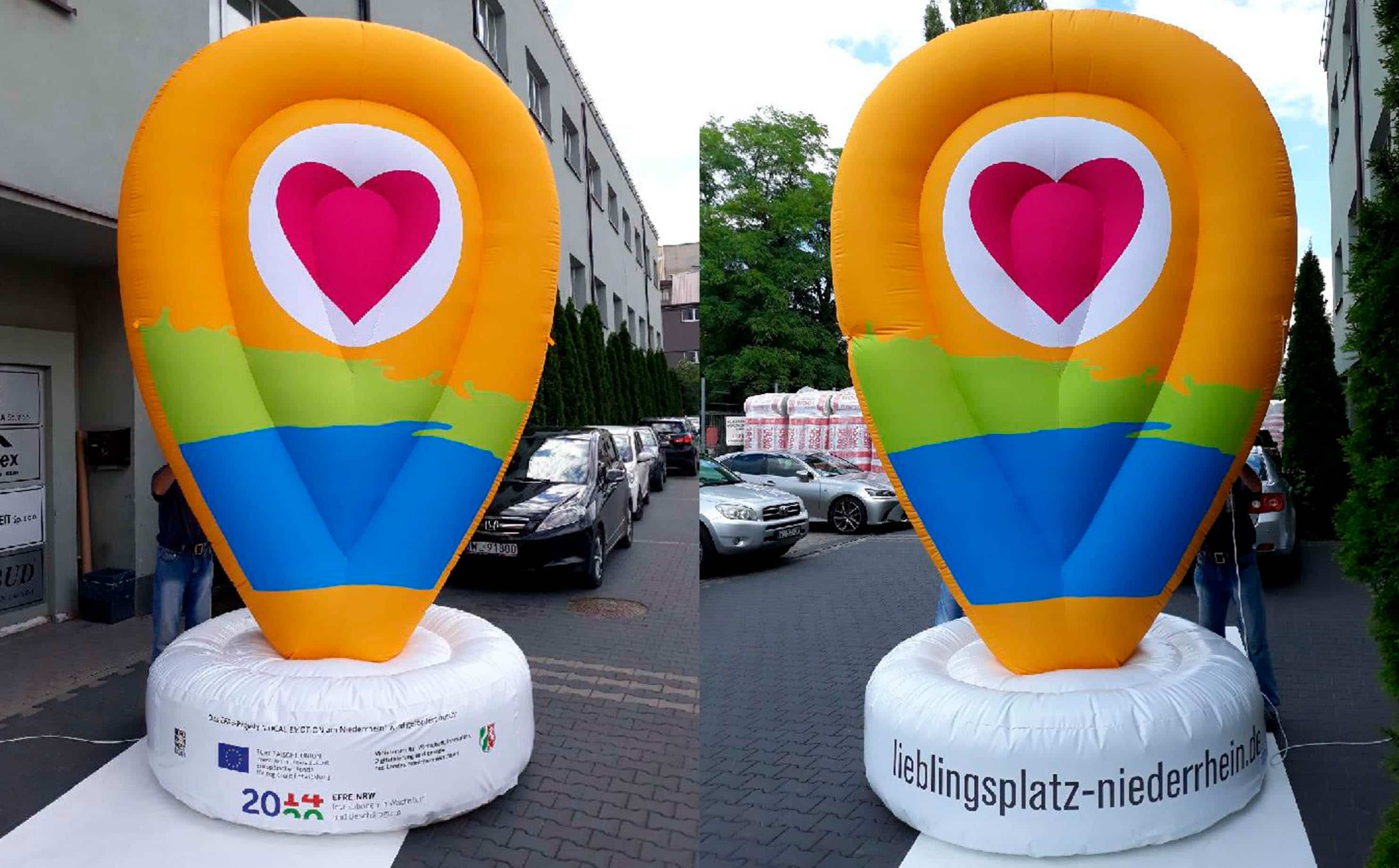 Für unseren Kunden haben wir einen aufblasbaren Pin mit Sockel angefertigt. Die Anfrage war nicht leicht: ein aufblasbarer stehender Pin. Bei einer nach unten spitz zulaufenden Figur geht bei Inflatables nur ein Sockel. So haben wir den Pin in einen Sockel gestellt und konnten diesen auch noch mit Wechselbannern versehen. Materialien: Sockel aus PVC, Pin aus Polyester vollflächig im Subliamtionsdruckverfahren bedruckt.