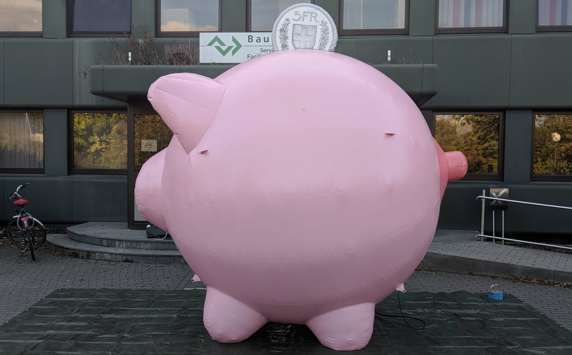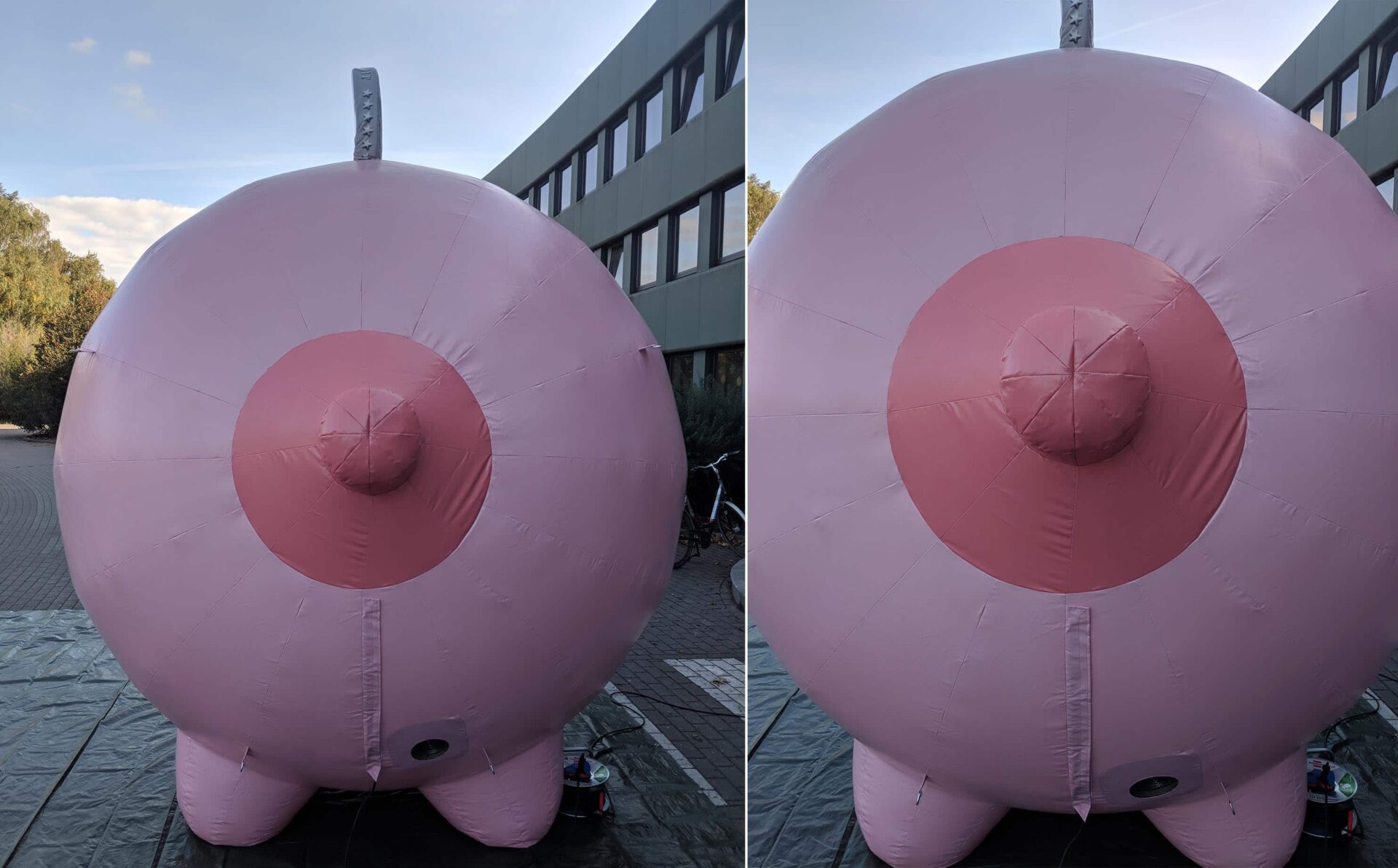 Wir haben einen 5m langen und 2m hohen aufblasbaren Turnschuh produziert. Vorne am Schuh hat er eine ausgeformte 3D-Sohle, der Rest ist per Digitaldruck bedruckt. Das Obermaterial ist Polyester b1, für die Sohle haben wir PVC verwendet.