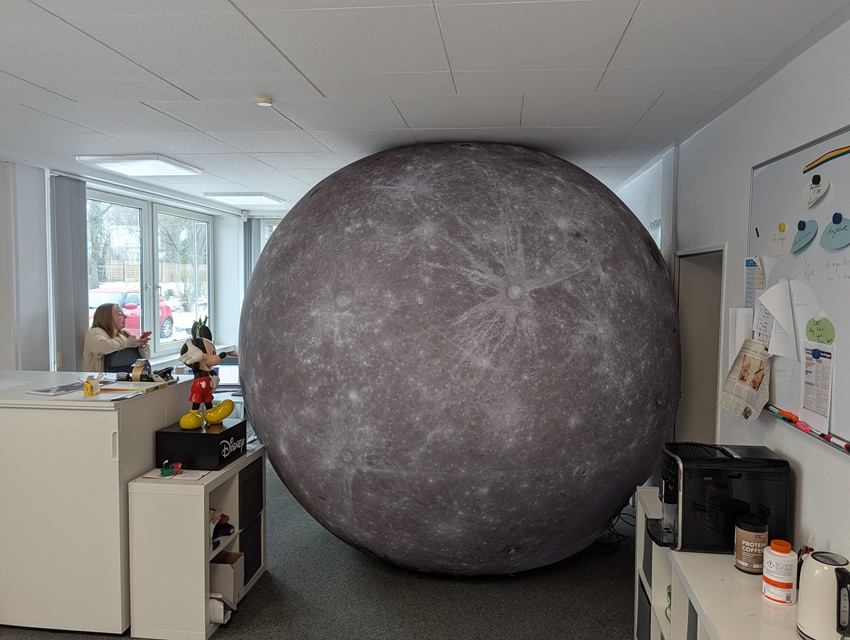 Wie auf dem Bild zu sehen ist, entfaltet dieser riesige Mond selbst in Büroräumen eine magische Präsenz – stellen Sie sich erst die Wirkung in einer hohen Halle vor, wenn er majestätisch von der Decke hängt!