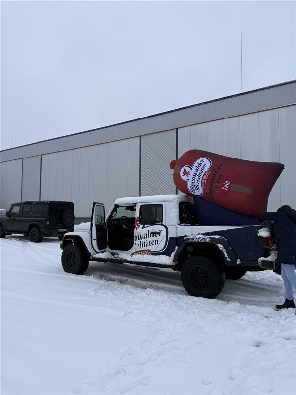 Doch eine so spektakuläre Sonderanfertigung braucht natürlich auch die richtige Bühne. Deshalb wurde die Riesen-Teewurst nicht einfach irgendwo aufgestellt, sondern als krönendes Element auf die Ladefläche eines komplett gebrandeten Pick-Up-Trucks montiert.