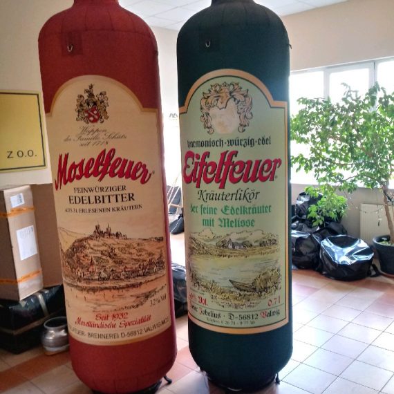 Wir haben zwei schöne aufblasbare Flaschen in 3m Höhe produziert. Material ist Polyester 280 gr/qm mit b1 Zertifikat. Bedruckung: vollflächiger Sublimationsdruck. Die Flaschen haben einen Holzboden als Standfuß, auf dem … lesen Sie mehr