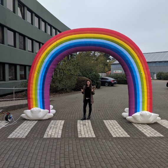 Als neues Vermietobjekt haben wir einen bunten Regenbogen – Torbogen mit einem Innemaße von 4x3m (BxH). Der Bogen ist aus Polyester 300 g/m² Material und die Wolken aus robusterem PVC.