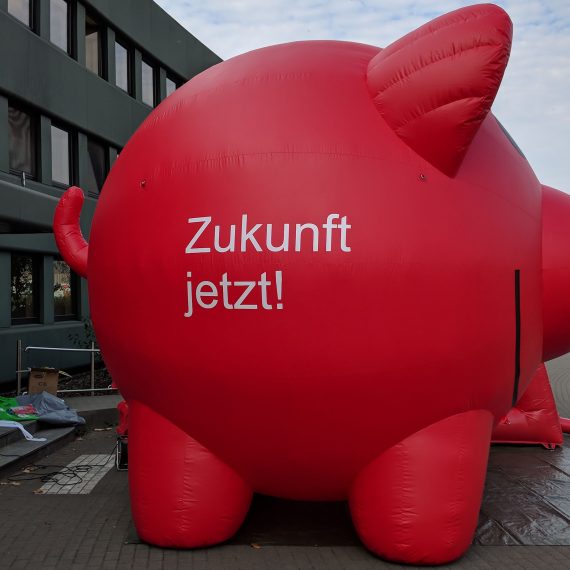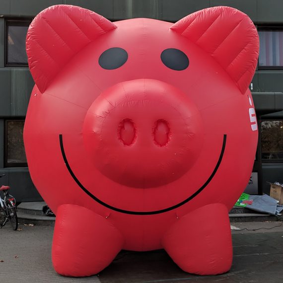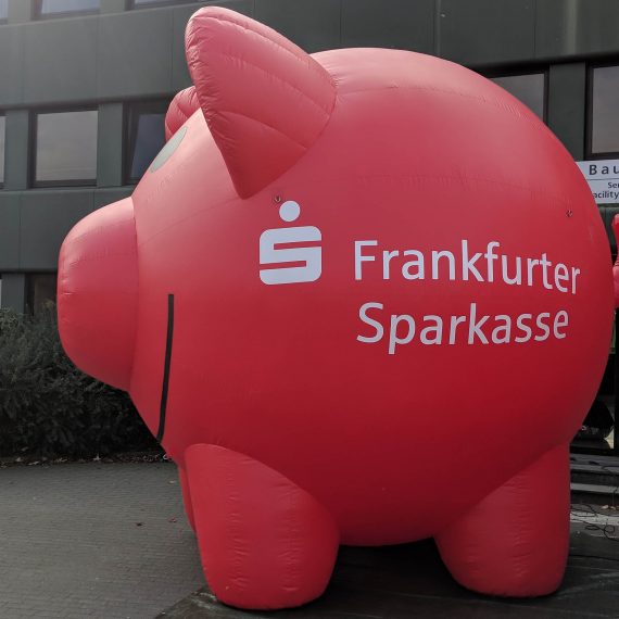 Wir haben für die Frankfurter Sparkassen ein 4m hohe aufblasbares Sparschwein produziert. Material PVC Standardfarben rot mit Siebdruck.