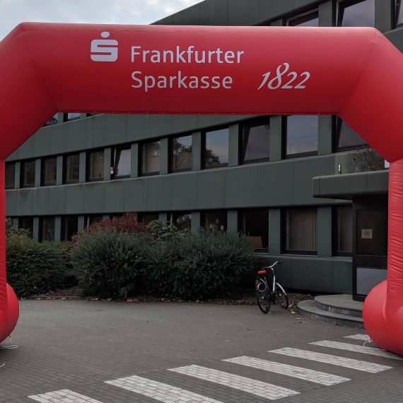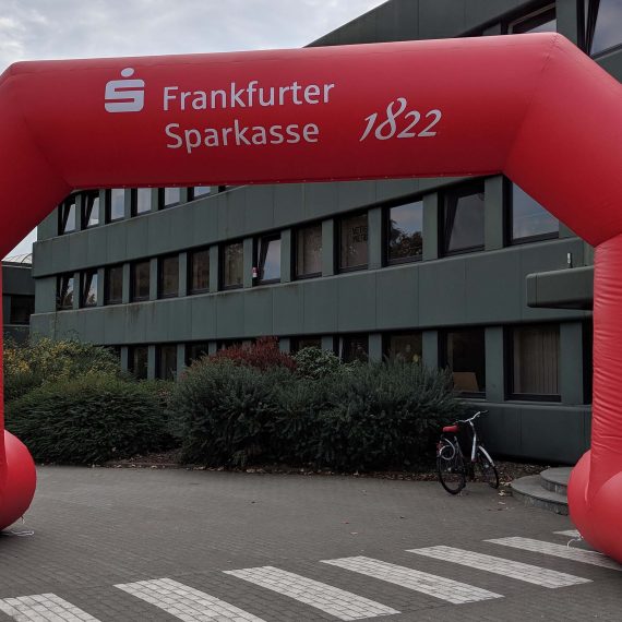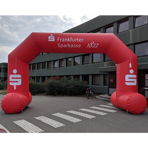 Für die Frankfurter Sparkasse haben wir einen aufblasbaren Torbogen mit T-Füßen produziert. Material 400 gr/qm PVC in rot, bedruckt per Siebruck-Verfahren, es können unter dem Balken Wechselbanner angebracht werden.
