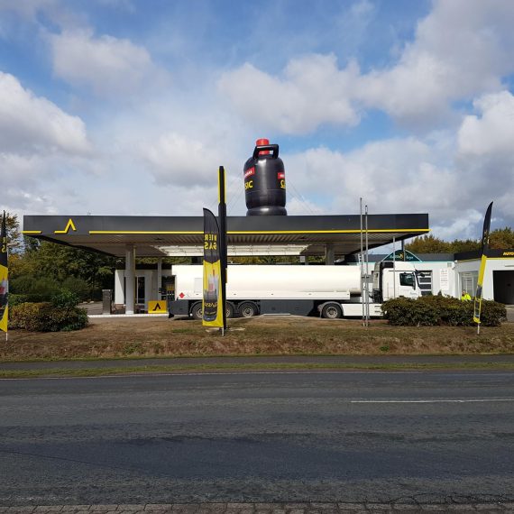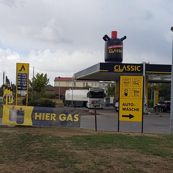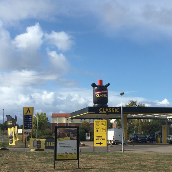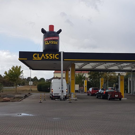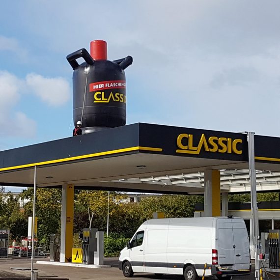 Für die „Classic Tankstelle“ haben wir eine 5,00 m hohe Gasflasche gebaut, die auf einem 50 cm hohen aufblasbarem Sockel steht.