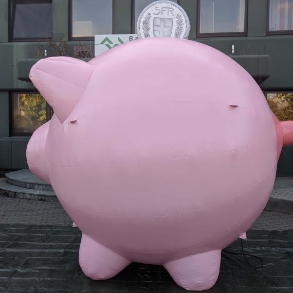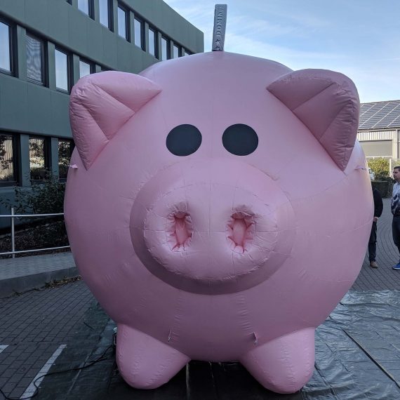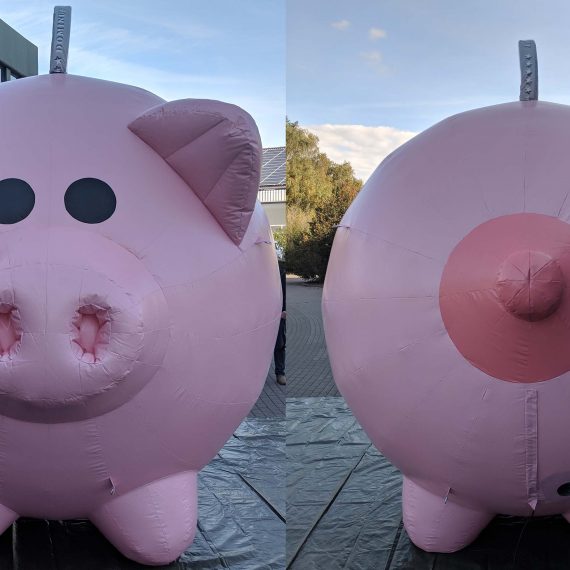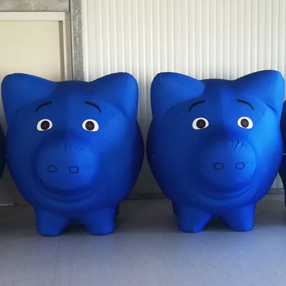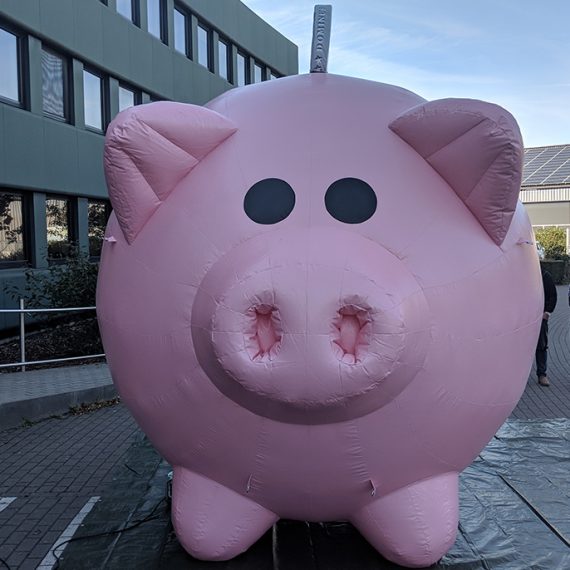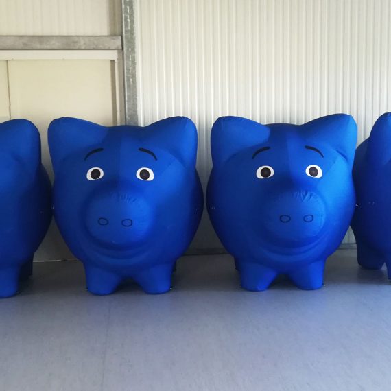 Wir haben vier auflasbare Spar-Schweine für den DG-Verlag hergestellt. Die luftdichten Schweine sind als Auto-Dach-Werbung gedacht. Material innen: PVC Außen: Polyester.