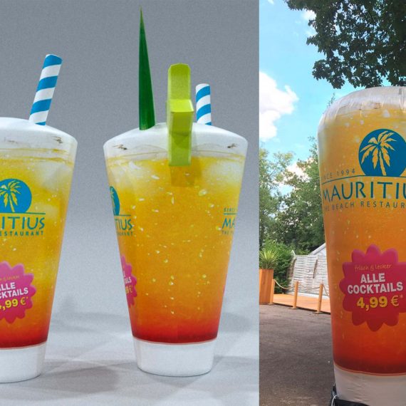 Für Mauritius haben wir ein aufblasbares Cocktailglas in 3m Höhe hergestellt. Material: PVC 300 gr/qm mit Dauergebläse und Beleuchtung auf dem Standfuß.