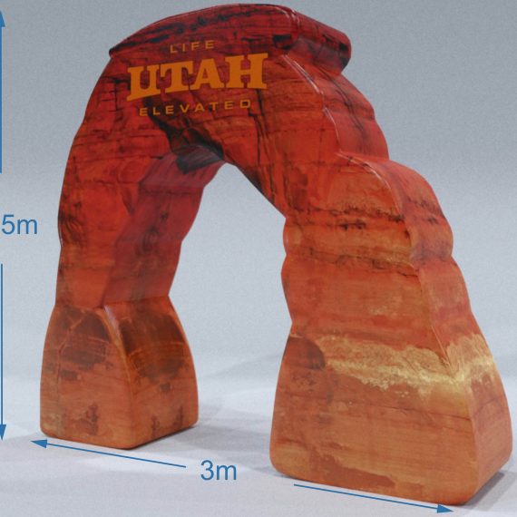 Wir haben einen Torbogen in Sonderform hergestellt: der Delicate Arch aus Utah wurde als Vorlage nachgebaut und auf Polyester b1 voll bedruckt.