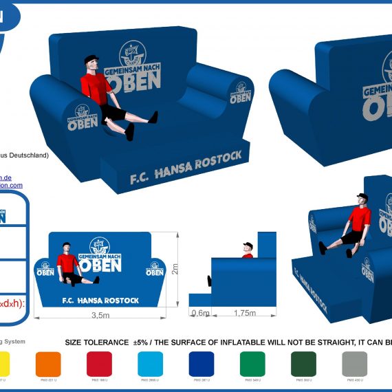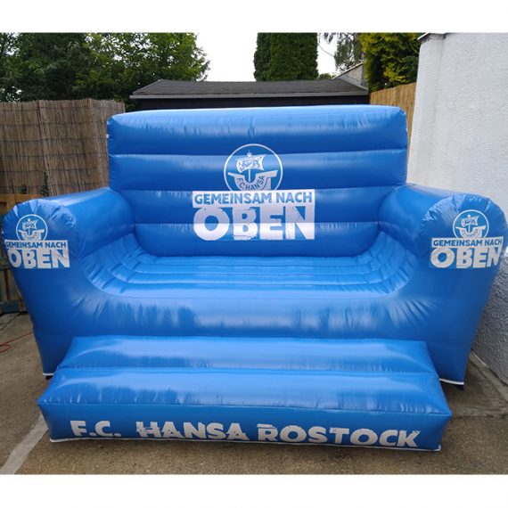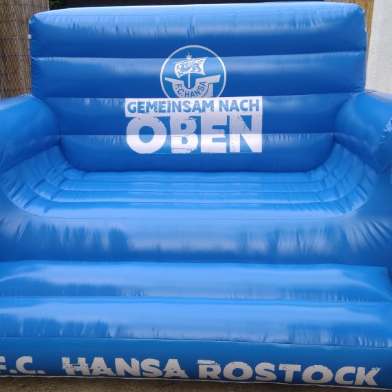 Ein aufblasbares Riesensofa haben wir für Hansa-Rostock hergestellt. Das Sofa wird für Promotions rund um das Stadion eingesetzt. Material: schweres PVC mit Logodruck an den Seiten und auf der Lehne. … lesen Sie mehr