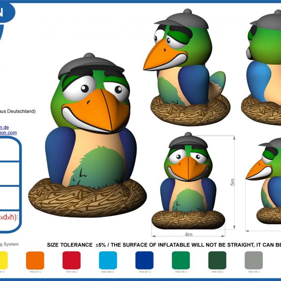 Einen aufblasbaren Vogel in 5m Höhe haben wir für die Sita-Airport-IT in Düsseldorf hergestellt. Der Vogel soll als Objekt vor dem Büro auf dem Dach sitzen. Material: Ptex 400 gr/qm … lesen Sie mehr