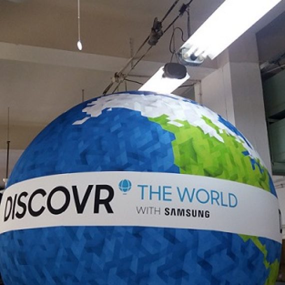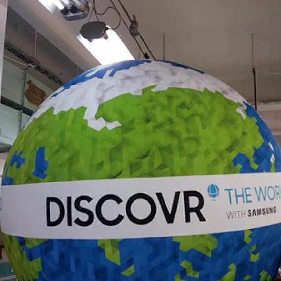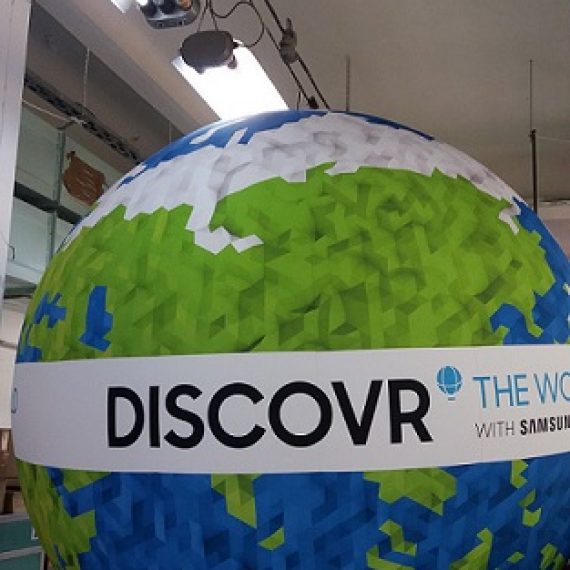 Die aufblasbare Weltkugel hat einen Durchmesser von ca. 2,5 m und wird über ein Elektrogebläse in Form gehalten.